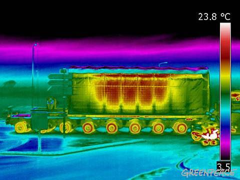 圖說:我們身邊所有的機器,都是可以關掉的。無論是電風扇、電腦、電鍋,只要把電源拔掉,它就停了。但是有一種機器是關不掉的,那就是核能發電廠的核子反應爐。就算停機、不想發電了,燃料總是欲罷不能,還會持續放射巨大能量,稍一不慎,要是冷卻系統失效,它甚至會引發爆炸。2013 年日本福島 (Fukushima) 的核電廠爆炸就是個實例。這就是核廢料的特性。就算「燒完了」,不能發電了,還要持續放出「衰變熱」(decay heat) 幾百年,甚至更久。這些核廢料成為人類文明的燙手山芋,連科技最先進的國家都找不到放心的處置方法。所以,各國的政府往往都偷偷摸摸,背著人民運輸這些核廢料。以上這些圖片是德國運輸核廢料的交通工具,途中總是要引起人民非常劇烈的抗議及阻撓。中間那張 [1] 是一般的可見光照片,左邊 [2] 和右邊 [3] 兩張是遠紅外線(又稱熱線)照片。照片上以顏色來代表溫度,至於顏色跟溫度對應的方式,每個攝影裝置都略有不同。