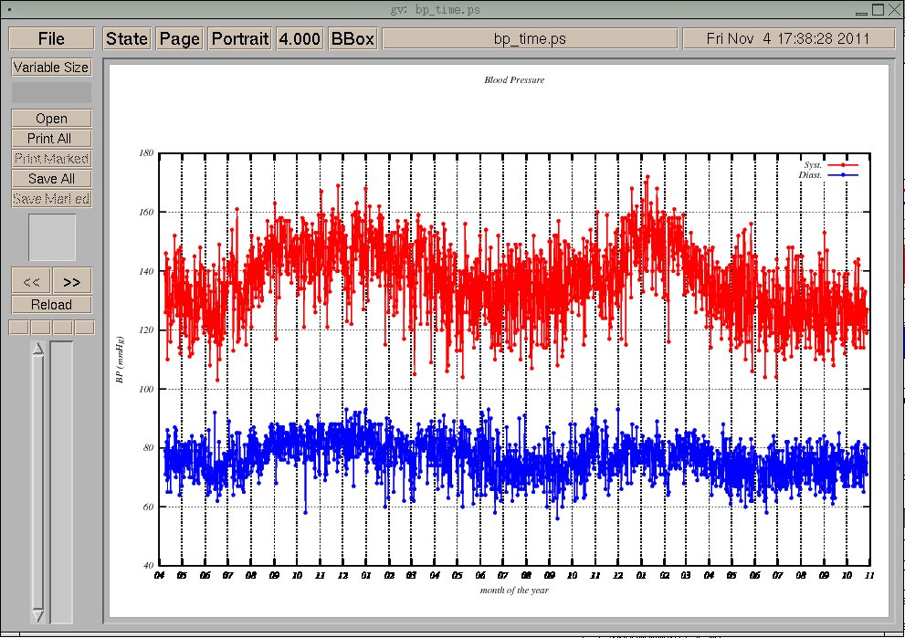 2009 年 4 月到 2011 年 10 月的收縮壓跟舒張壓,早晚各測量一次。由圖中可見趨勢是,夏天氣溫高的時候,血壓低,冬天氣溫低的時候,血壓會上升。其他的統計數據以及分析,待續。
