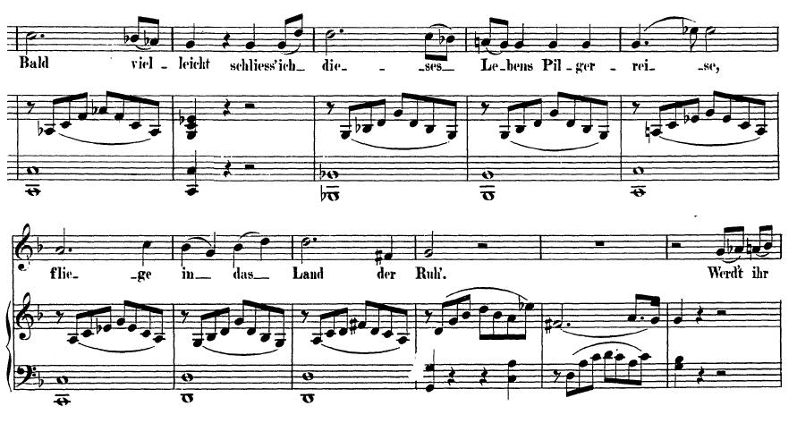Bald vielleicht (mir weht, wie Westwind leise, eine stille Ahnung zu), schließe ich dieses Lebens Pilgerreise, fliege in das Land der Ruh.原詩裡的小括弧符號不見得都會排版在樂譜裡,學習這首曲子的時候,最好自己用鉛筆把小括號放上去,這會幫助我們理解莫札特作曲的時候所遭遇到的挑戰。
