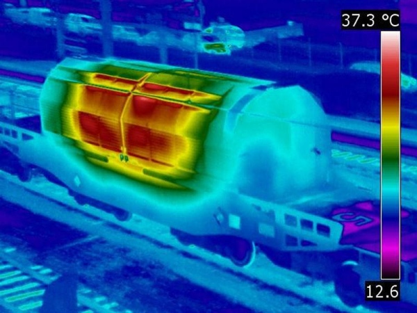 圖說:我們身邊所有的機器,都是可以關掉的。無論是電風扇、電腦、電鍋,只要把電源拔掉,它就停了。但是有一種機器是關不掉的,那就是核能發電廠的核子反應爐。就算停機、不想發電了,燃料總是欲罷不能,還會持續放射巨大能量,稍一不慎,要是冷卻系統失效,它甚至會引發爆炸。2013 年日本福島 (Fukushima) 的核電廠爆炸就是個實例。這就是核廢料的特性。就算「燒完了」,不能發電了,還要持續放出「衰變熱」(decay heat) 幾百年,甚至更久。這些核廢料成為人類文明的燙手山芋,連科技最先進的國家都找不到放心的處置方法。所以,各國的政府往往都偷偷摸摸,背著人民運輸這些核廢料。以上這些圖片是德國運輸核廢料的交通工具,途中總是要引起人民非常劇烈的抗議及阻撓。中間那張 [1] 是一般的可見光照片,左邊 [2] 和右邊 [3] 兩張是遠紅外線(又稱熱線)照片。照片上以顏色來代表溫度,至於顏色跟溫度對應的方式,每個攝影裝置都略有不同。