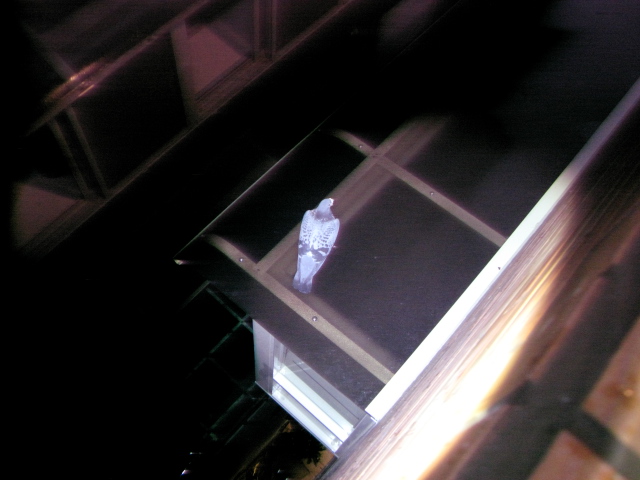 到了晚上快九點,忽然發現牠已不在八樓屋簷上。用手電筒四處掃描了一下,赫然看到牠在對面七樓的屋簷上。那裡不會淋到雨。偶爾出去看一下,千呼萬喚,牠就是無動於衷。好吧,你畢竟是個鳥。今天應該吃得夠飽。溫度計顯示室外溫度攝氏 15 度以上。外面或許比較適合你過夜。