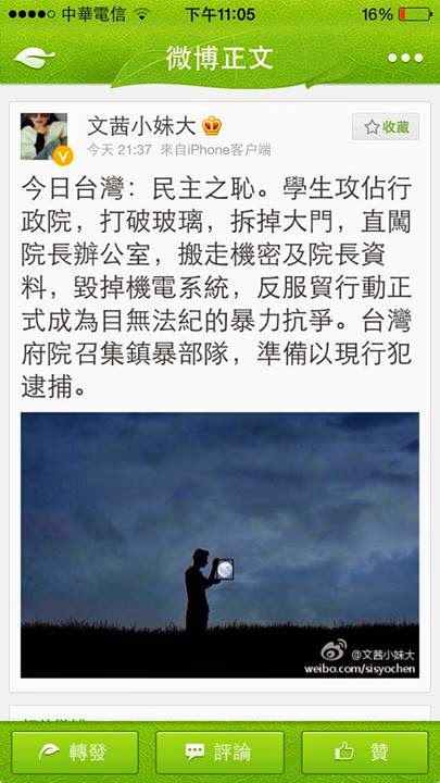 各位好 我是中天記者李爵安本人[6] 陳文茜, 微博, 2014-03-23